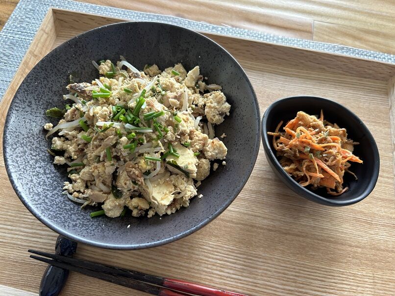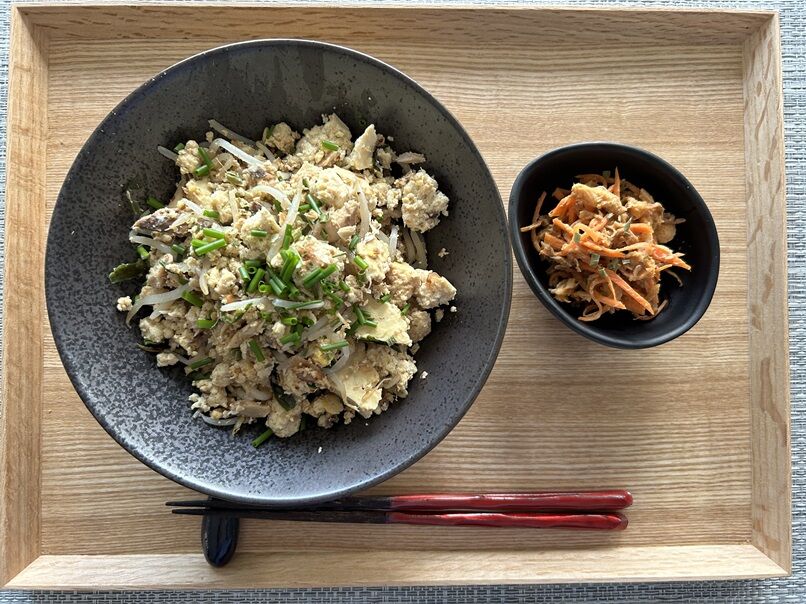 冷凍庫から出しておいた納豆を中心に、残り物なども考慮しての適当ごはん。