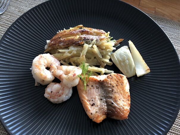 ジャーマンポテト風には、昨日の豚ロース肉の残りを薄く切ってカリッと焼いて入れました。