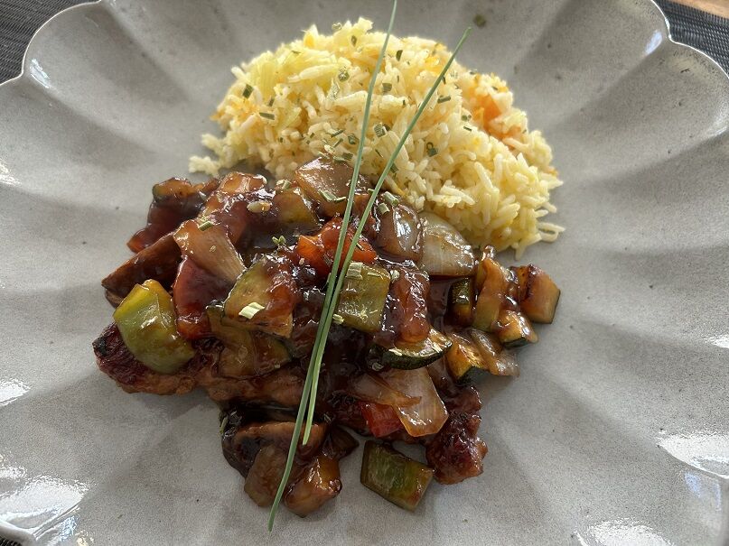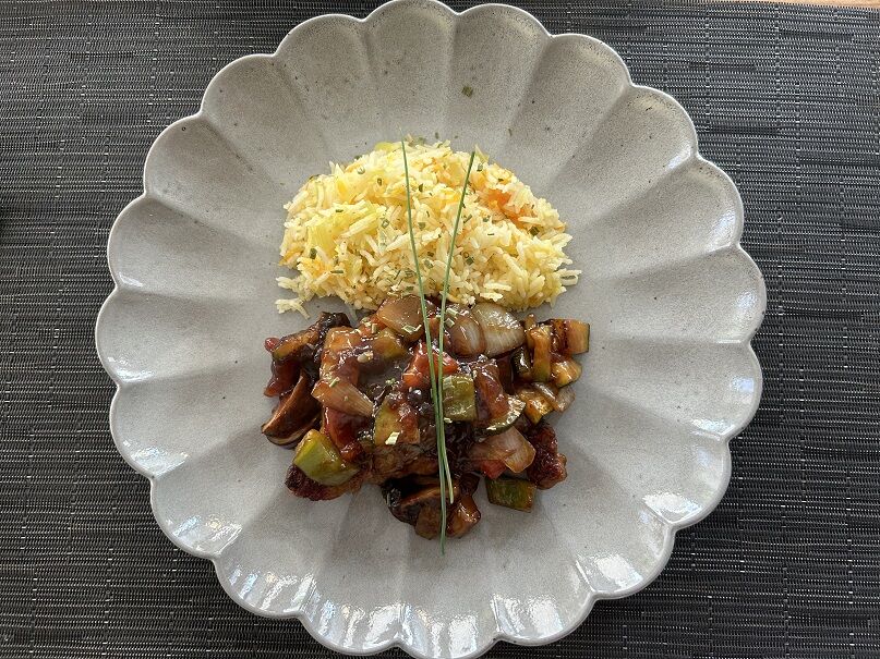 人参とポロねぎを入れたバスマティライスと一緒に頂きます。