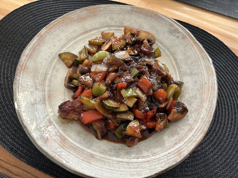 ソースには、玉ねぎ、緑と赤のパプリカ、ズッキーニ、ブラウンマッシュルームを。