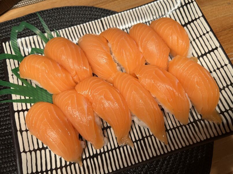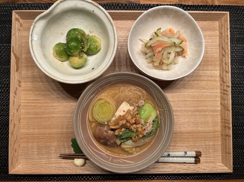 箸休めは芽キャベツのごま和え、スモークサーモンと玉ねぎときゅうりのマリネ。
