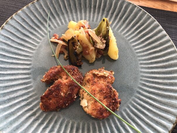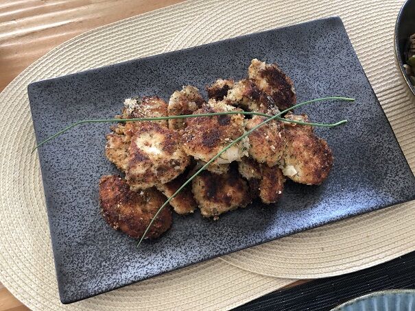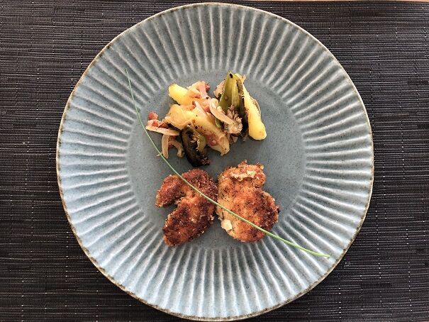 パン粉は自作で、パセリとパルメザンチーズを混ぜて、スライスした鶏ムネ肉にまぶして、