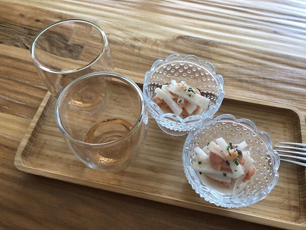 今日は帰宅時間が既に18時過ぎだったので、残り物の(笑)マリネを食前酒と一緒に頂きました。