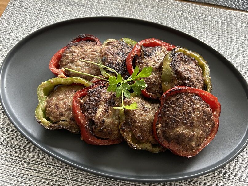パプリカは緑と赤を輪切りにして肉詰めに。