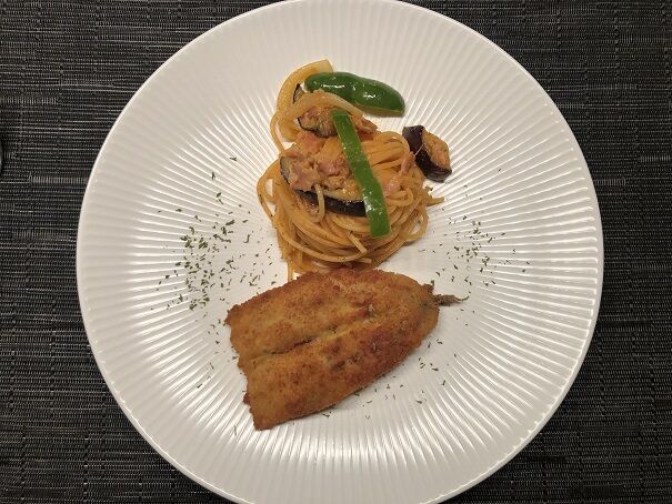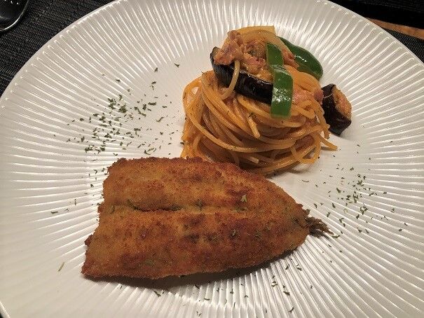 添えたのは、茄子入りのスパゲッティーニ・ナポリタン。