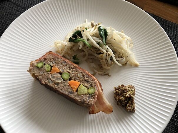 付け合わせは、じゃがいも、人参、グリーンアスパラガス、マッシュルーム。